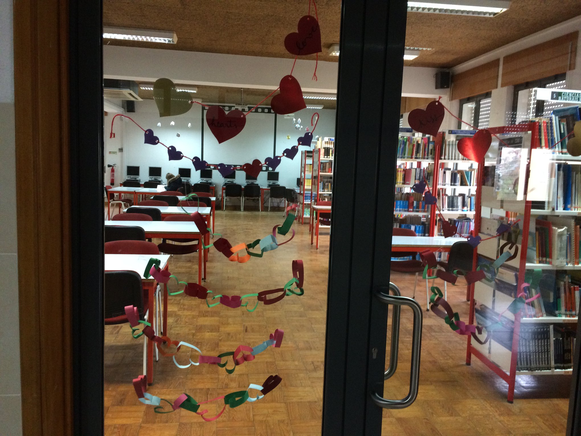 Os alunos do 3.º ciclo encheram a biblioteca de amor para o Dia dos Namorados. As mensagens em francês, inglês e espanhol deliciaram os visitantes. As turmas do 7.º C e E também contribuíram para espalhar o amor neste dia, lendo poemas de vários autores em vários espaços da escola.