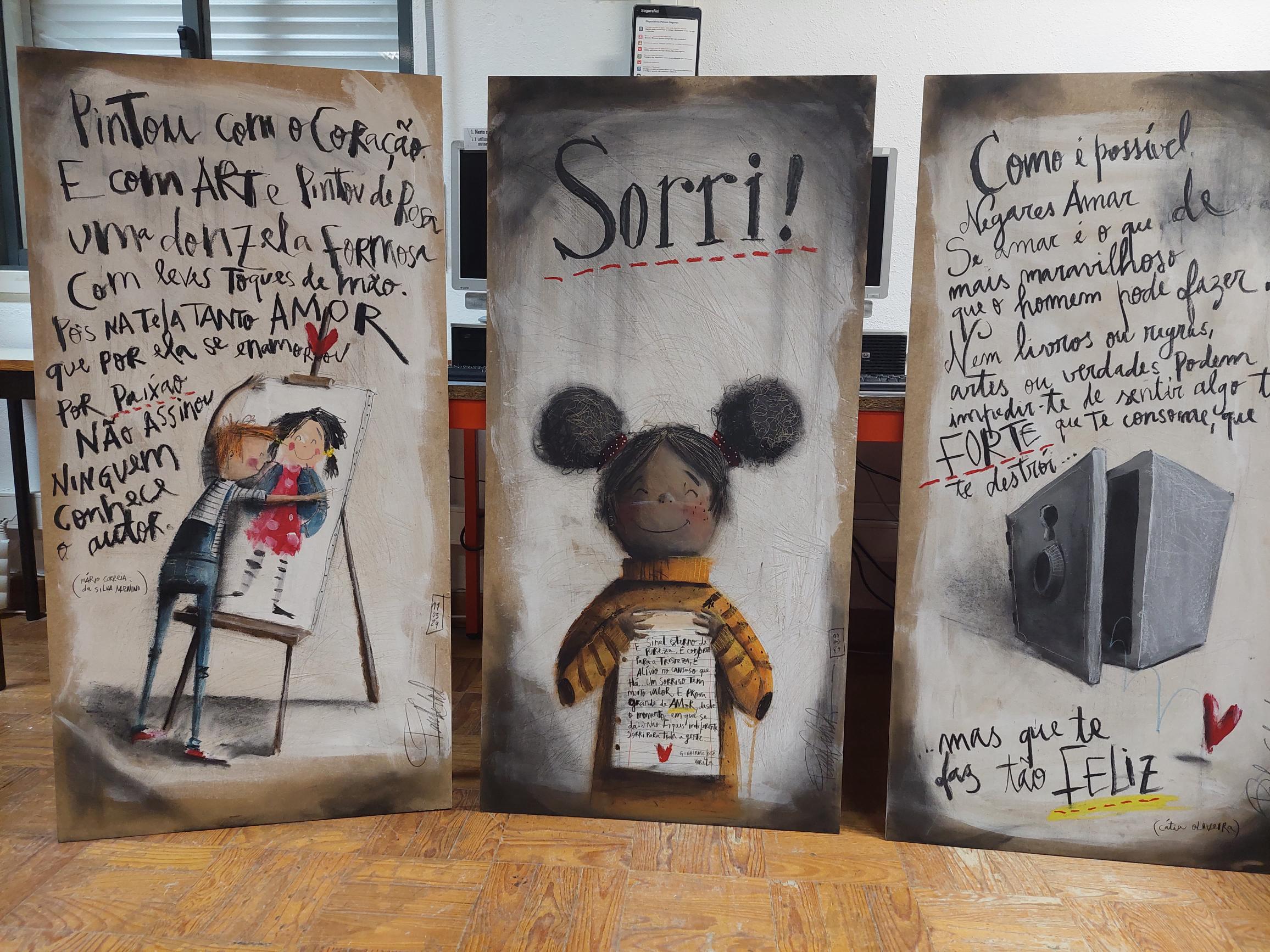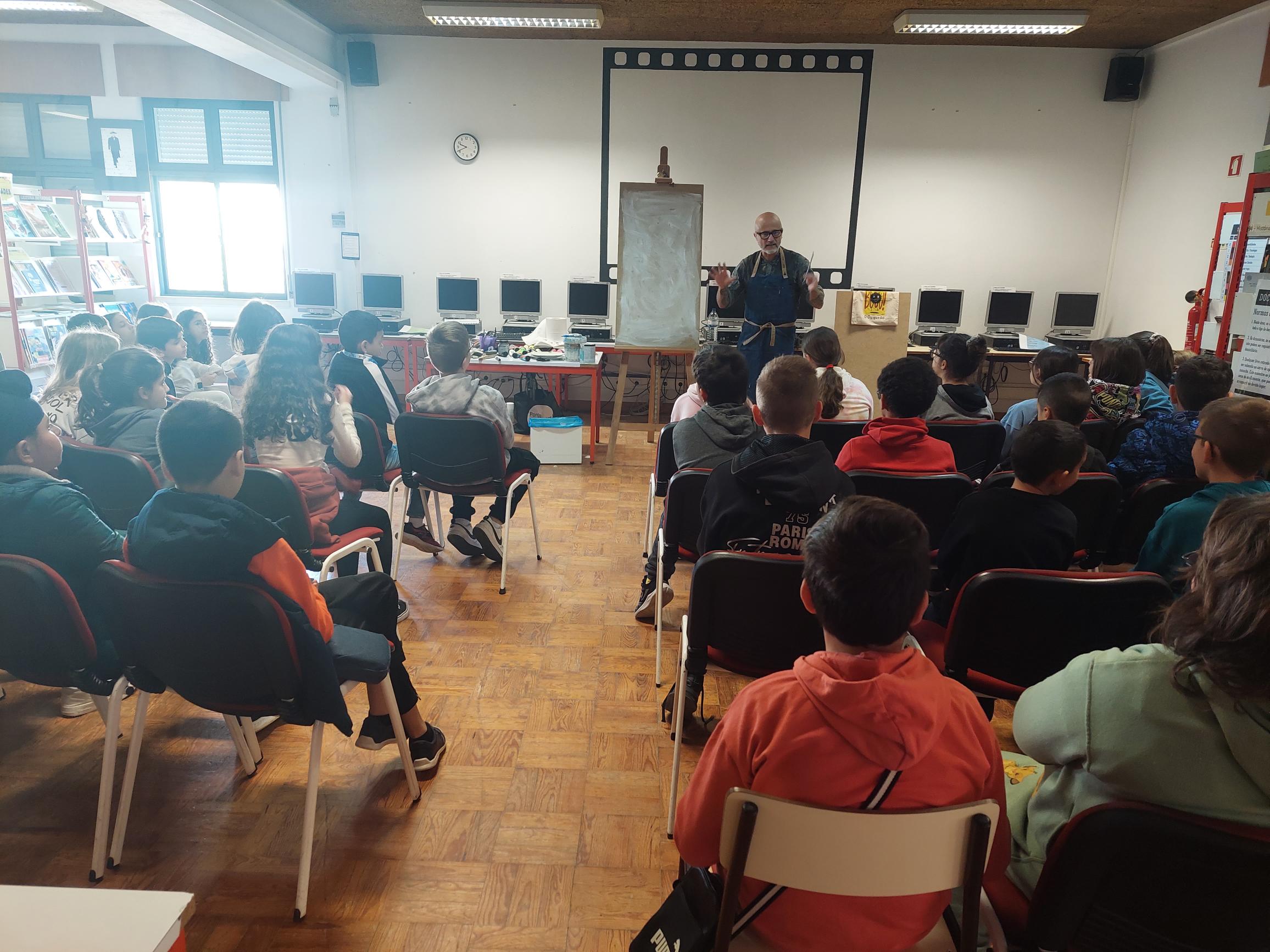 Ao longo das três sessões, patrocinadas pela Biblioteca Municipal de Portimão, o ilustrador conhecido sobretudo pelo livro "O Cuquedo" deliciou com a sua arte e expressividade os alunos do 5ºA, 5ºB, 5ºC, 5ºE, 5ºF e 6ºA. Durante as três sessões, o Ilustrador foi contando a sua história de vida e à medida que aplicava um conjunto de técnicas de pintura foi ilustrando poemas de escritores portimonenses pouco conhecidos. O resultado final foi a pintura de três painéis que foram oferecidos à nossa biblioteca, os quais serão brevemente expostos.