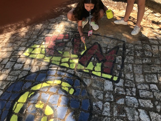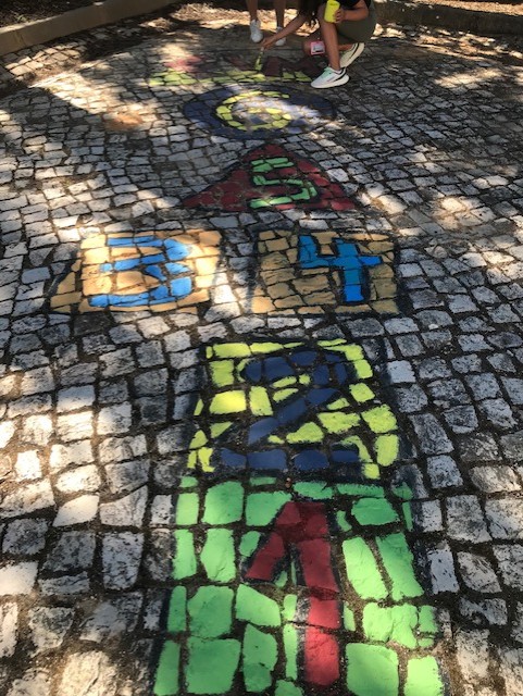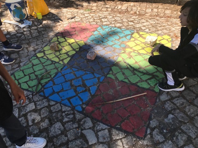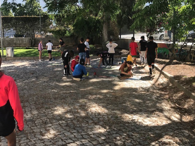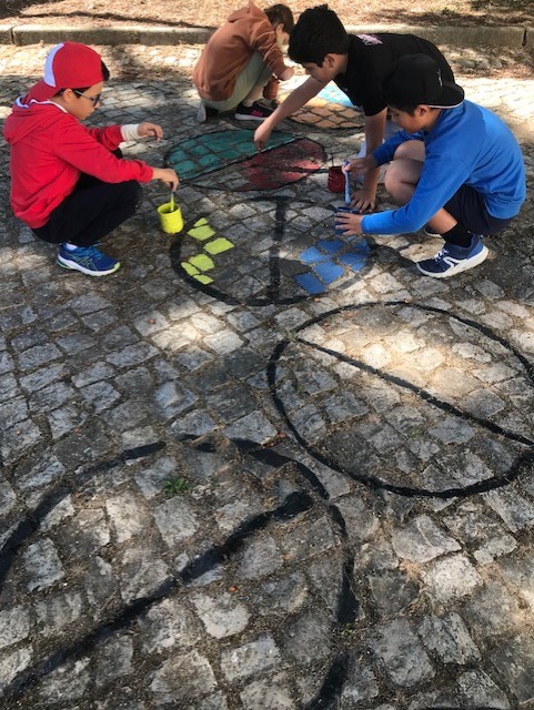 Selecionaram-se algumas das ideias mais exequíveis e, de acordo com estas, os alunos foram-nas desenhando e pintando no chão da escola, em vários locais, durante os meses de Maio e Junho.