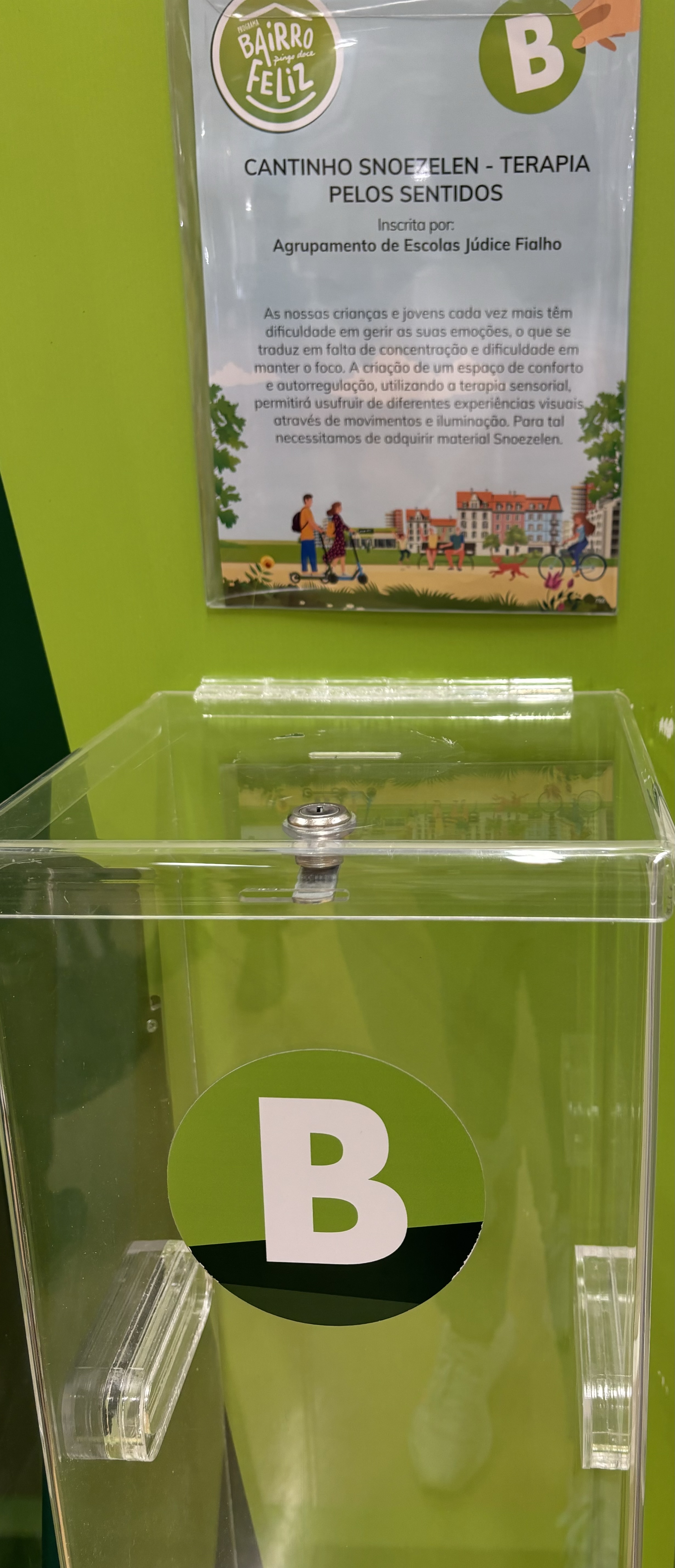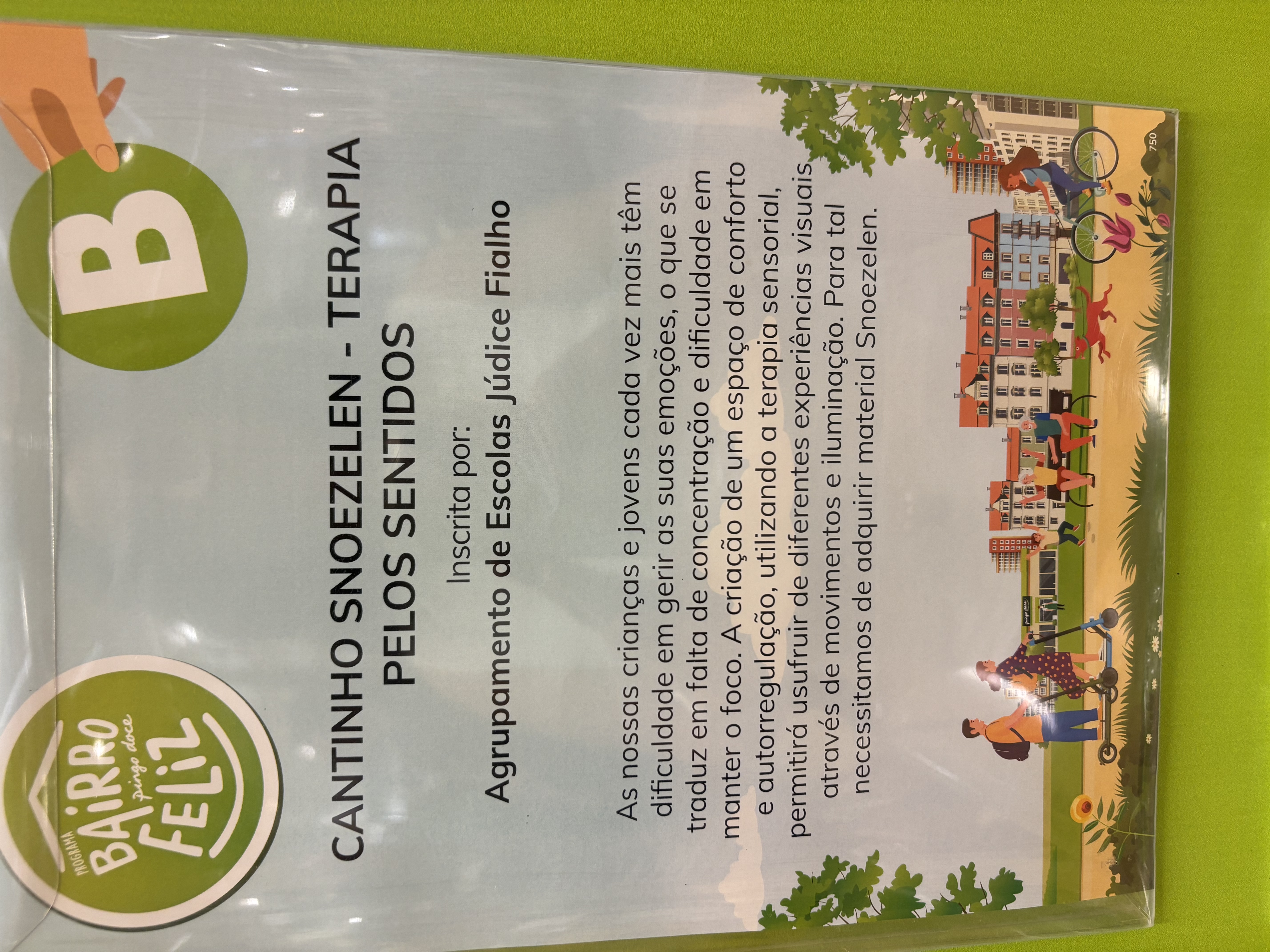 O Agrupamento de Escolas Júdice Fialho tem uma ideia a votação no programa Bairro Feliz, no Pingo Doce em Portimão - Craveiros ( perto da GNR). É a ideia B - Cantinho Snoezelen, Terapia pelos sentidos. Gostaríamos que, caso façam compras neste Pingo Doce, votem na nossa ideia para que possamos criar um espaço tão especial para os nossos alunos. Para os que vão a outro Pingo Doce, poderão trazer as moedas para a sua escola e entregar a um professor. Muito obrigada a todos pela colaboração.