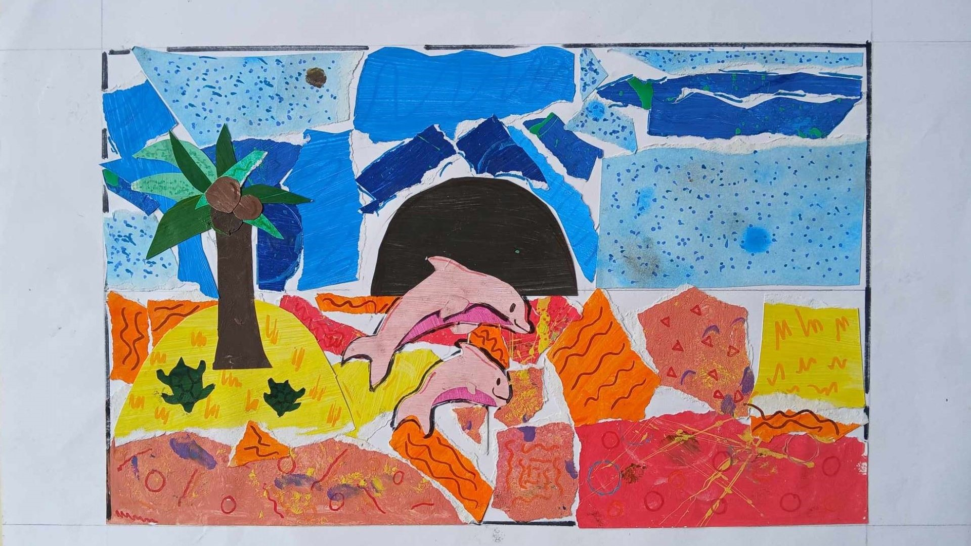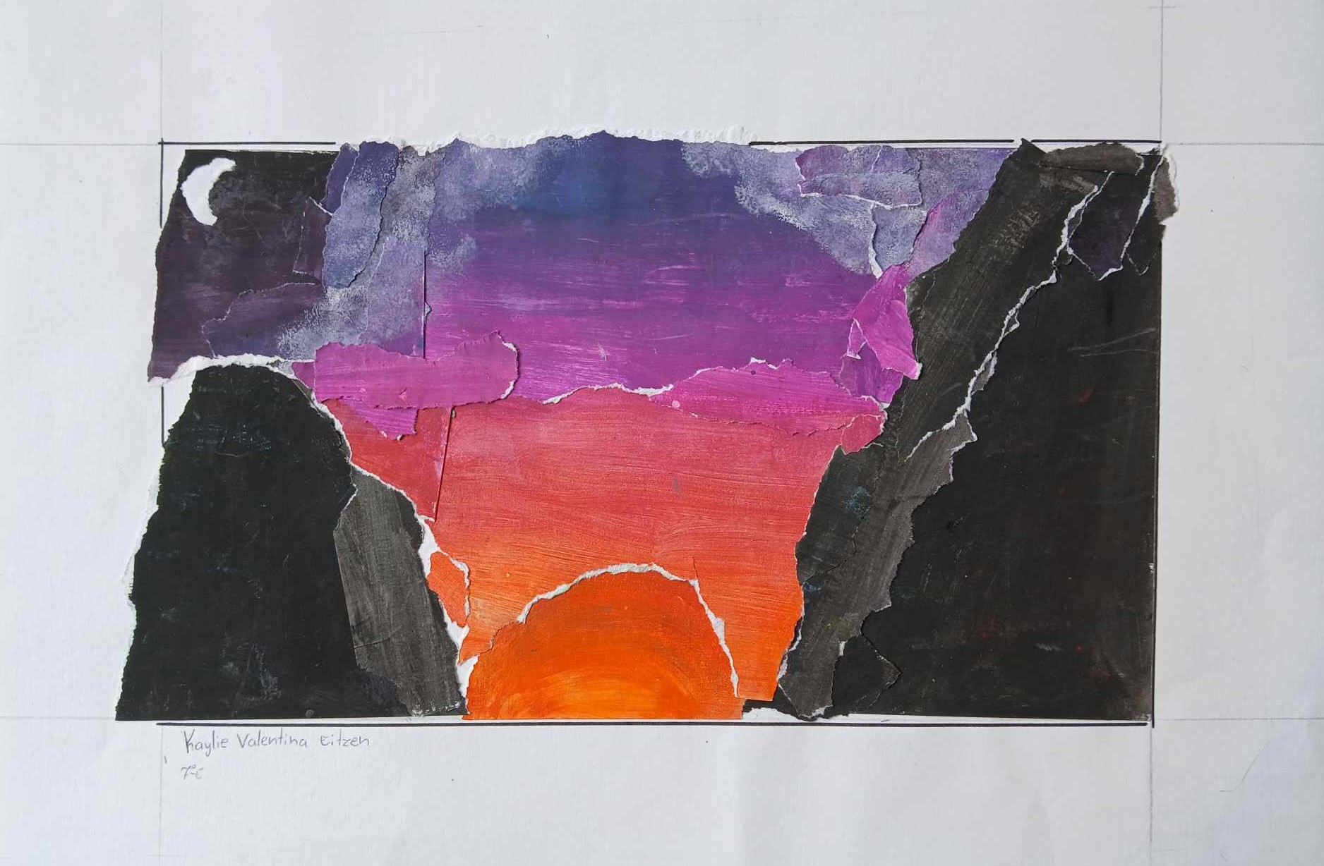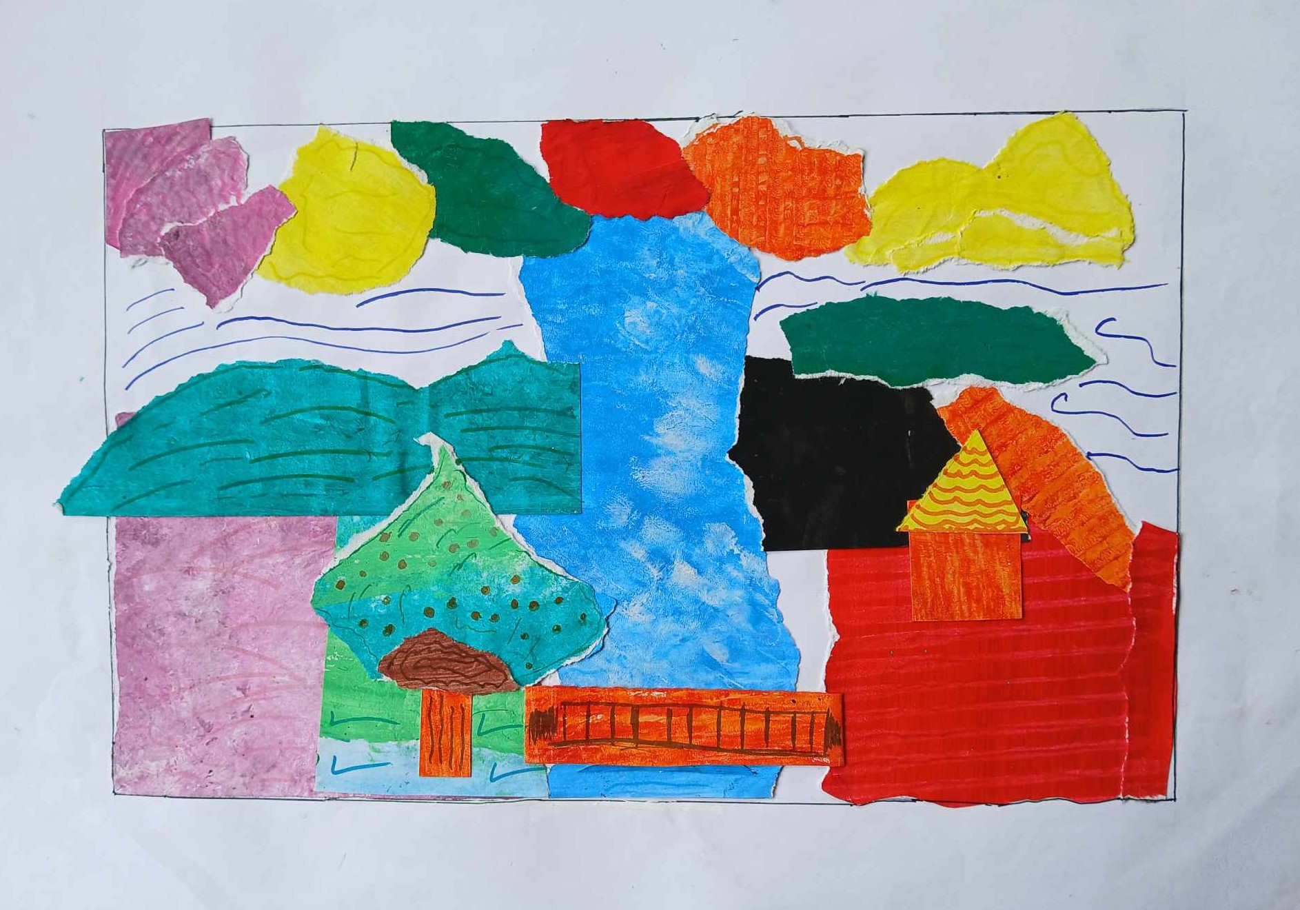 Os alunos dos 7º anos na disciplina de Educação Visual foram convidados a pintar folhas A4 com cores, texturas e grafismos. Depois deveriam fazer uma composição, uma paisagem figurativa ou abstrata, usando recortes e colagem de pedaços das folhas coloridas.