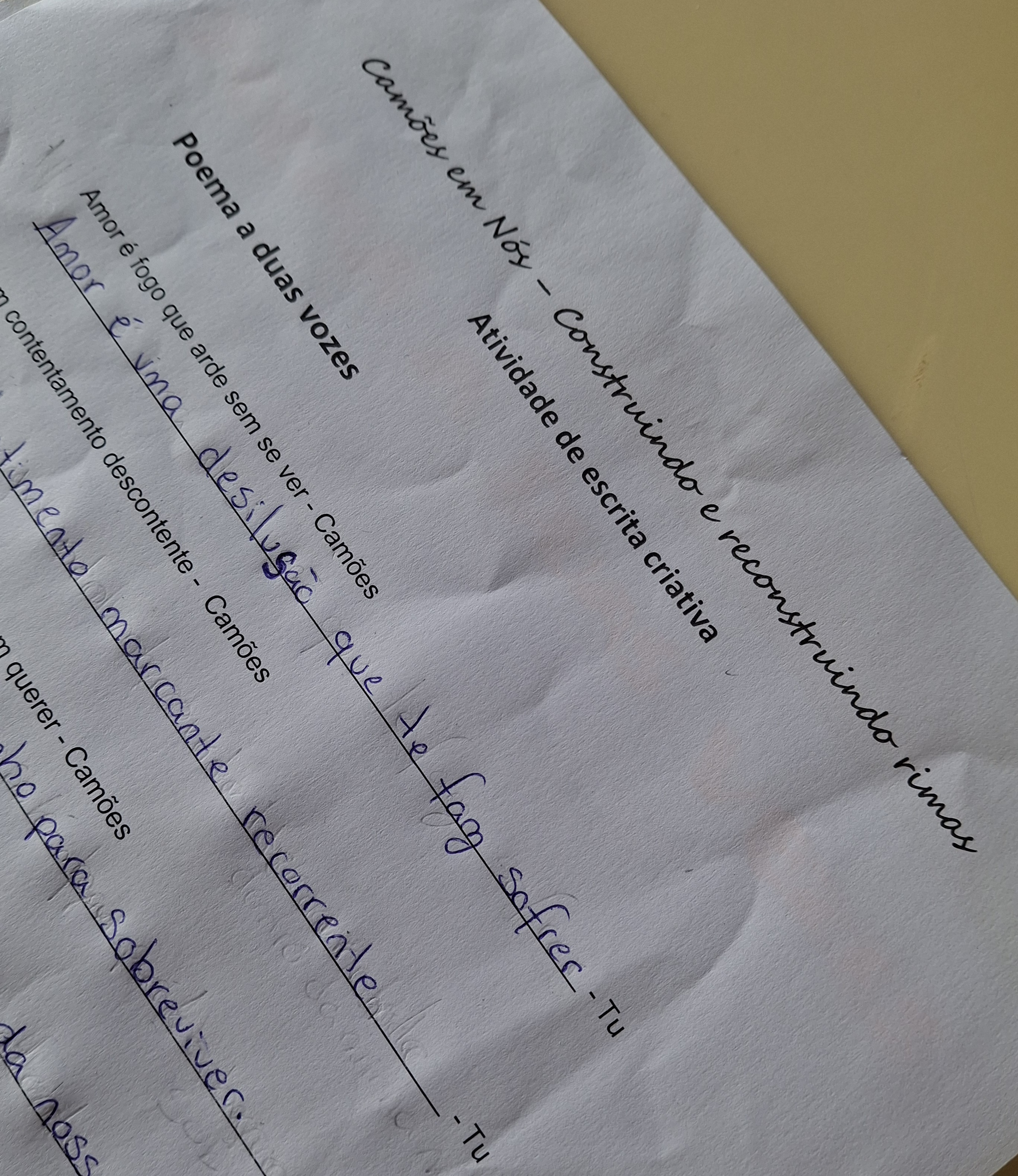 Esta atividade foi organizada de modo a haver uma troca das professoras de Português, que, de acordo com os seus horários, desenvolveram as tarefas em turmas diferentes das suas. Durante a atividade, os alunos contactaram com a poesia lírica camoniana, dedicando-se à leitura de poemas selecionados, à sua interpretação, alteração e recriação, apresentando, de forma expressiva, à turma, o trabalho final. Todos os estudantes participaram com grande entusiasmo, envolvendo-se nas tarefas propostas.